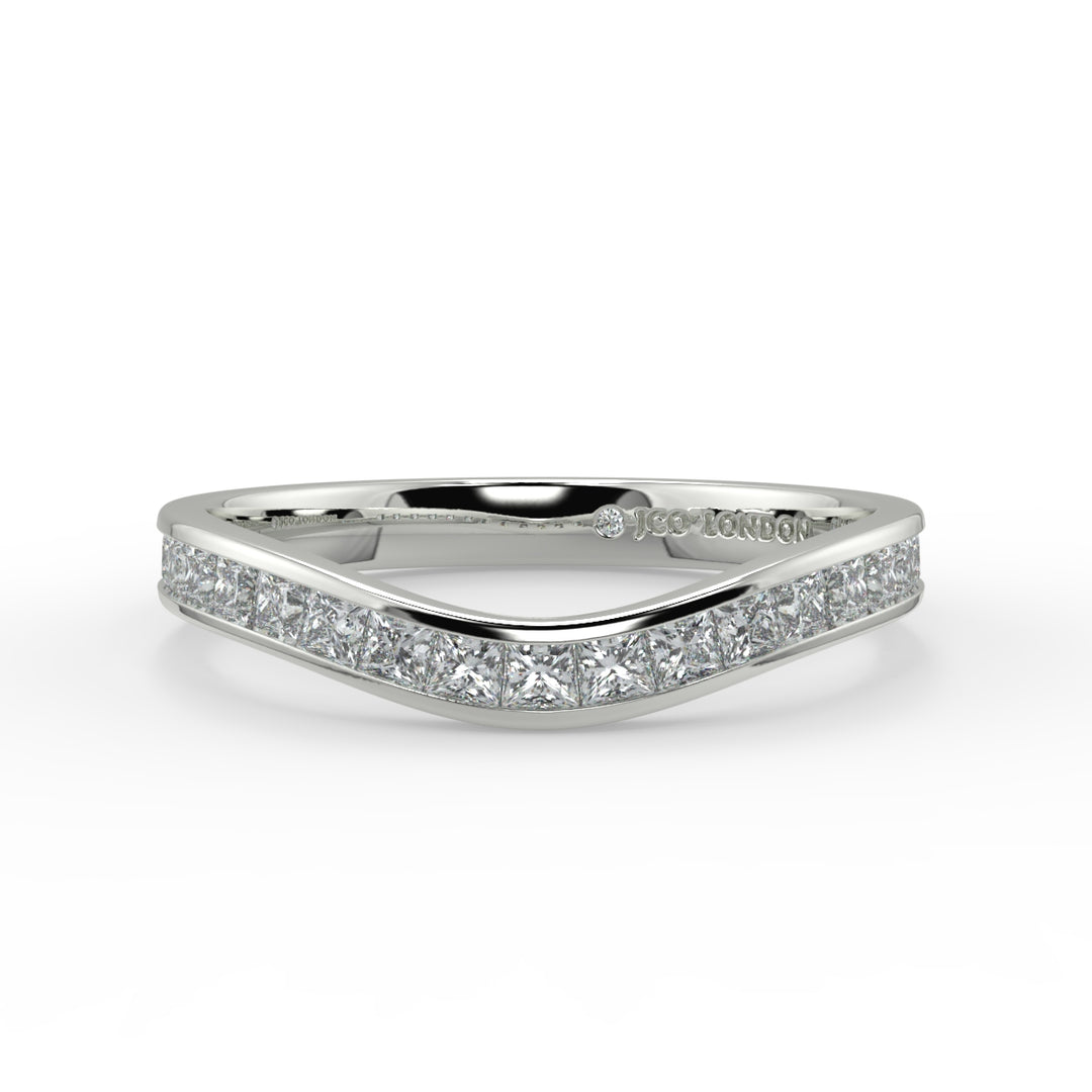 "Svelte" captures a sleek and robust look with its princess cut diamonds and slight channels of metal emphasizing the graceful curve of the band.